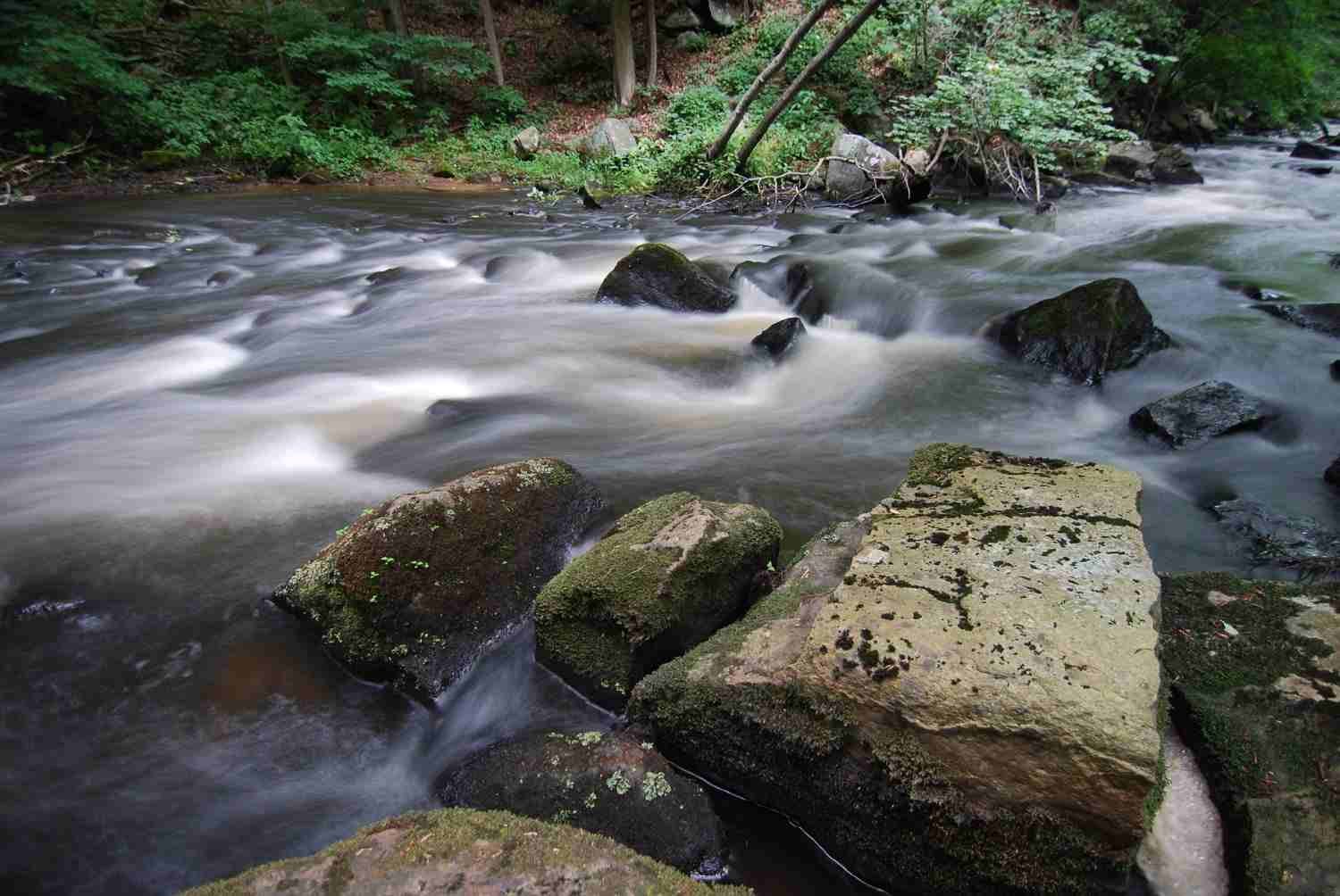 Especially the rocks in the upper third of the photo, the most vertical portions of motion, slow the sense of speed and draw the eye to them to experience a complex feeling of variegated flow.