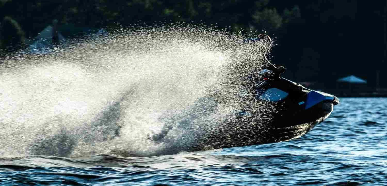 The fact that the waverunner is black and blue allows for greater visual emphasis on the spray.