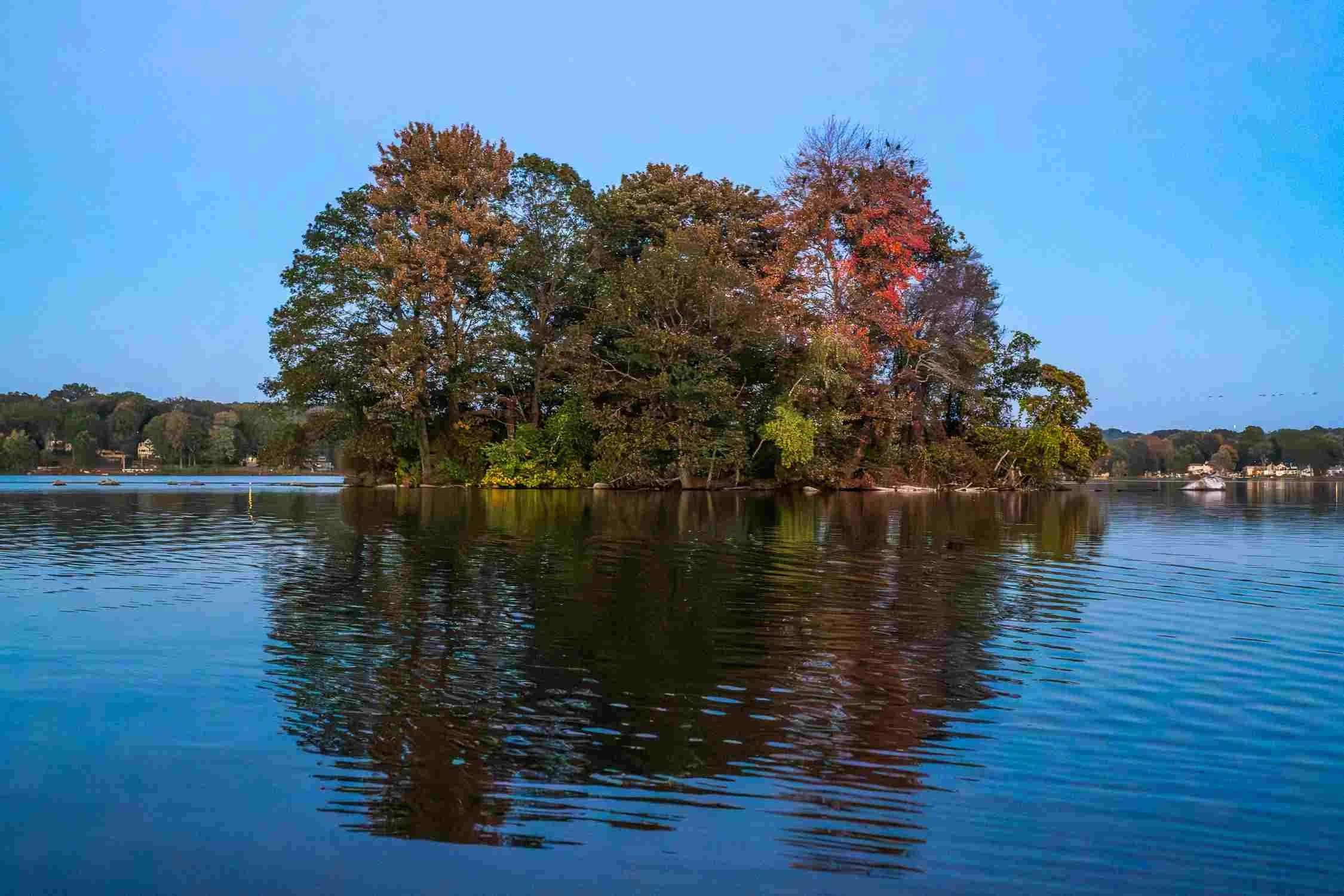 Lake Musconetcong’s only island in cool blue light after sundown.